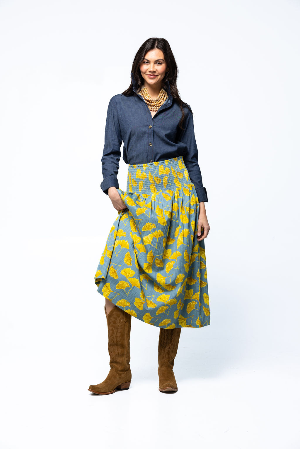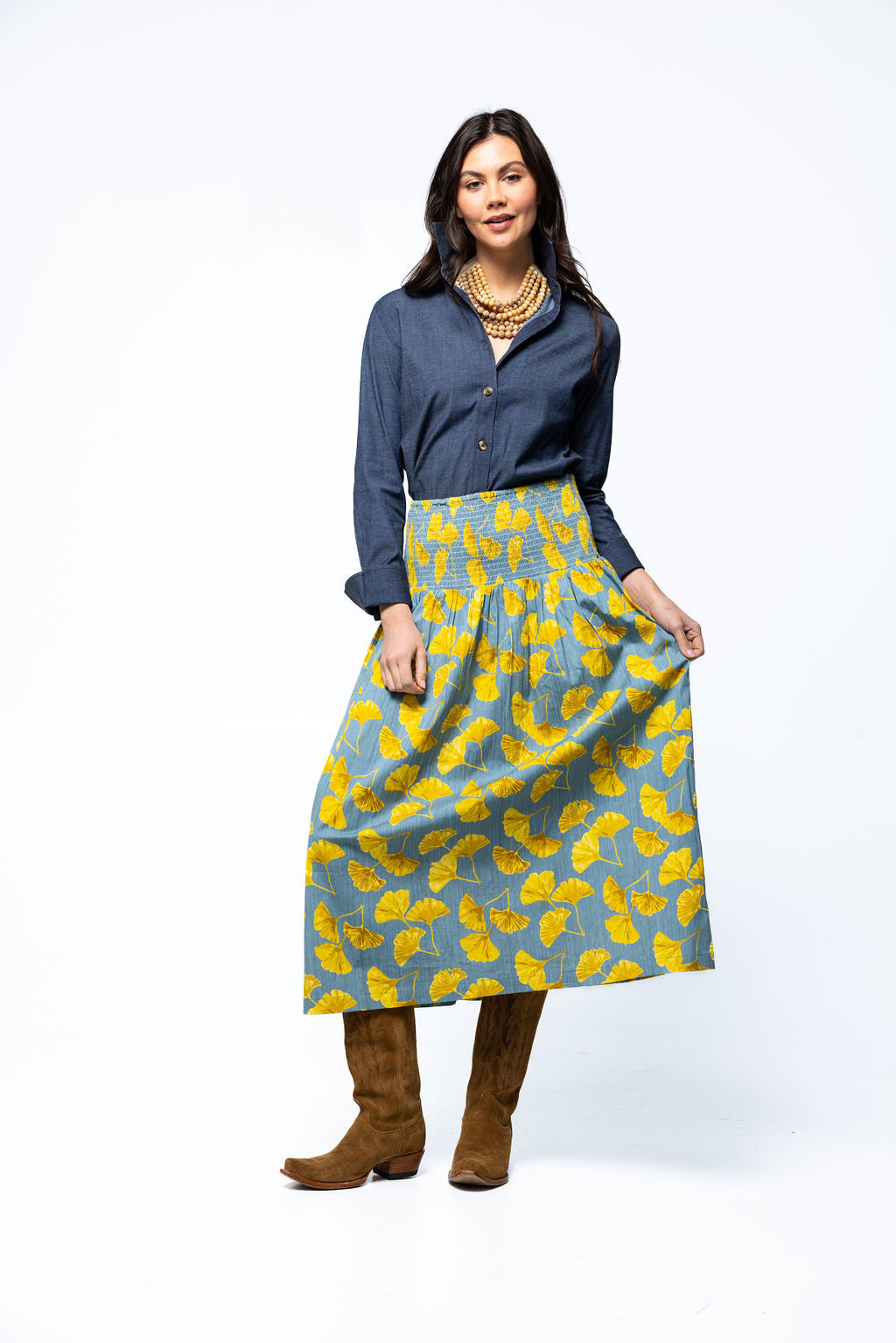 You asked for it and we did it, we made a SKIRT! This smocked waist skirt can be styled for your autumn days or your party evenings. This versatile piece will take you from fall fields to the autumn bonfire! Midi length, wide smocked waist, pleats and stretch poplin.