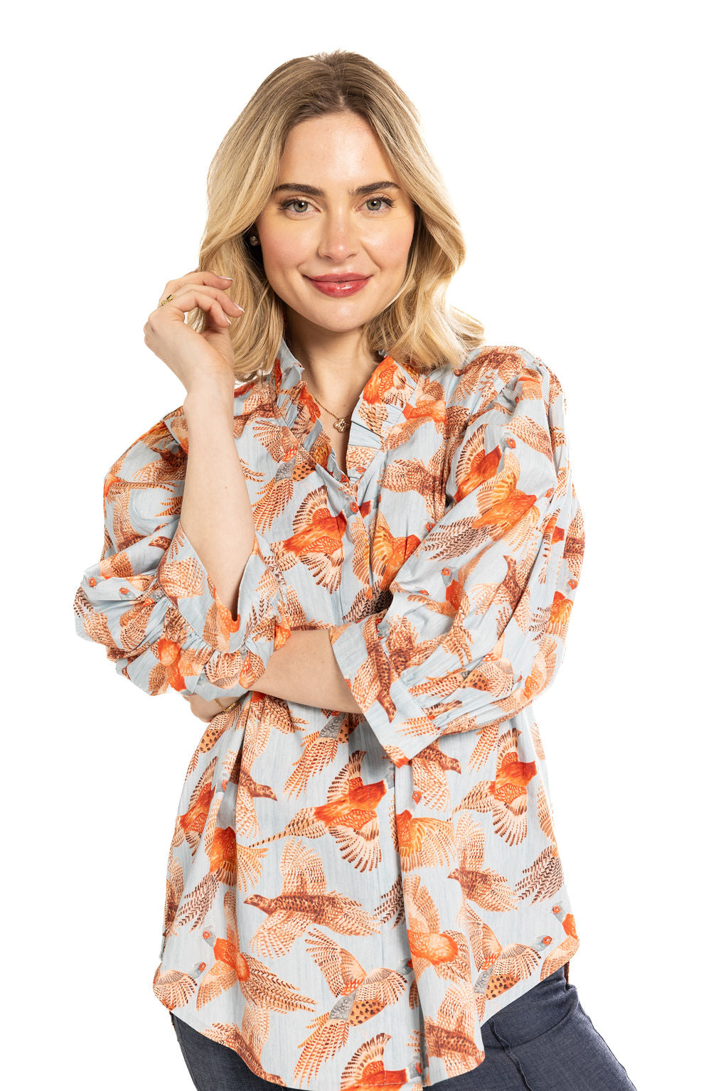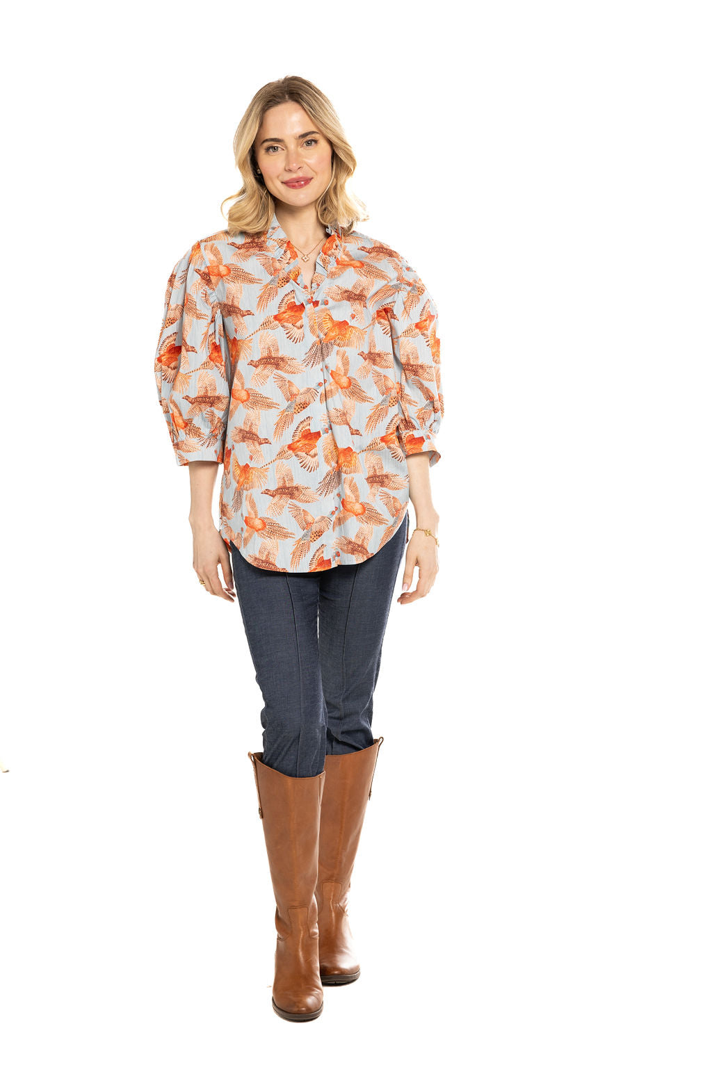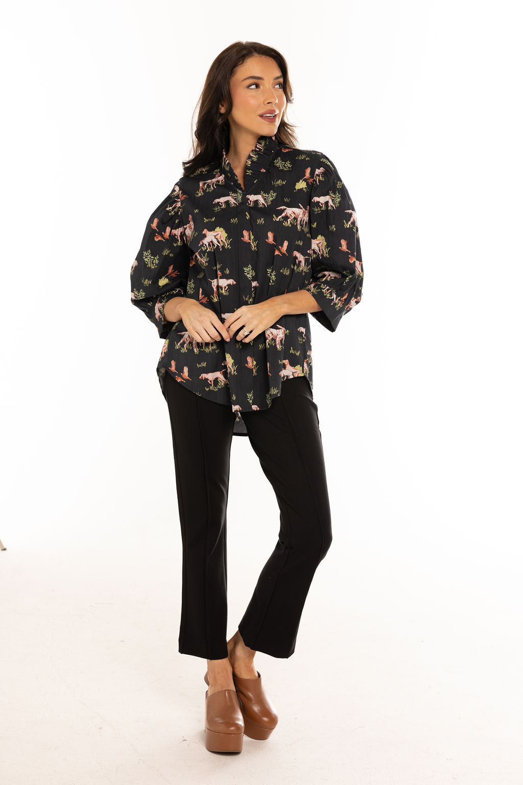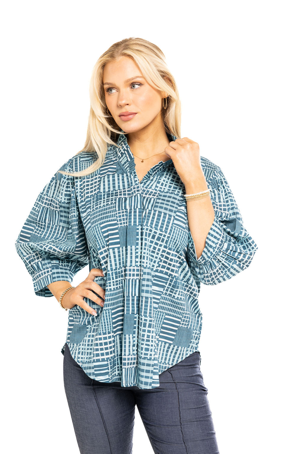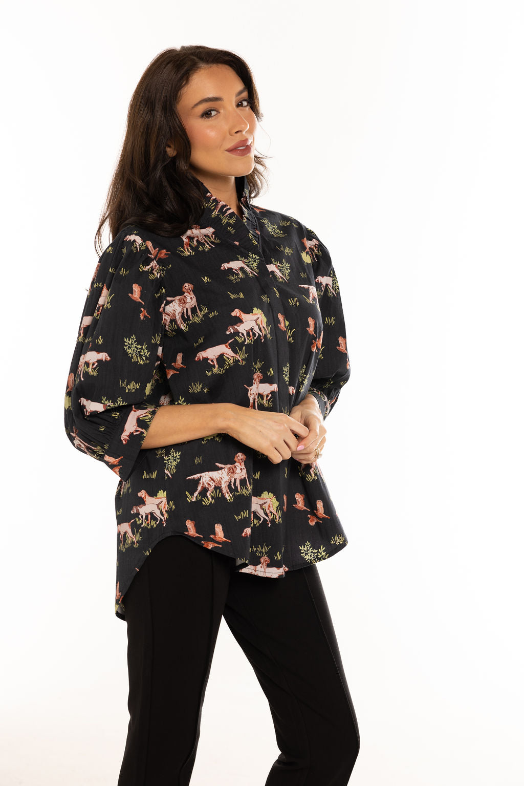 This blouse features a ruffled stand collar, covered placket and pleated sleeves.